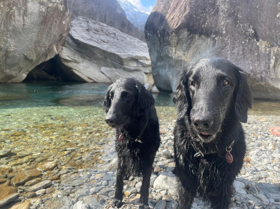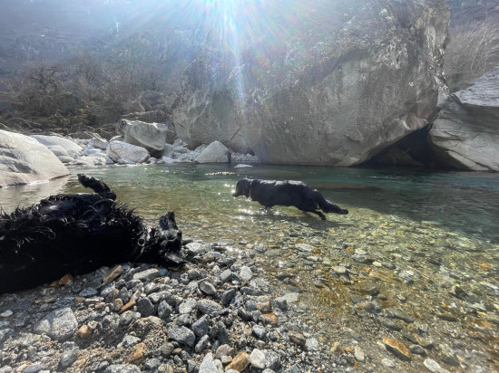Mali und Ziva durften mit Noemi mit ins Tessin und genossen selbstverständlich bereits ein Bad in der Maggia. Hach, tut so ein Bad gut :-).